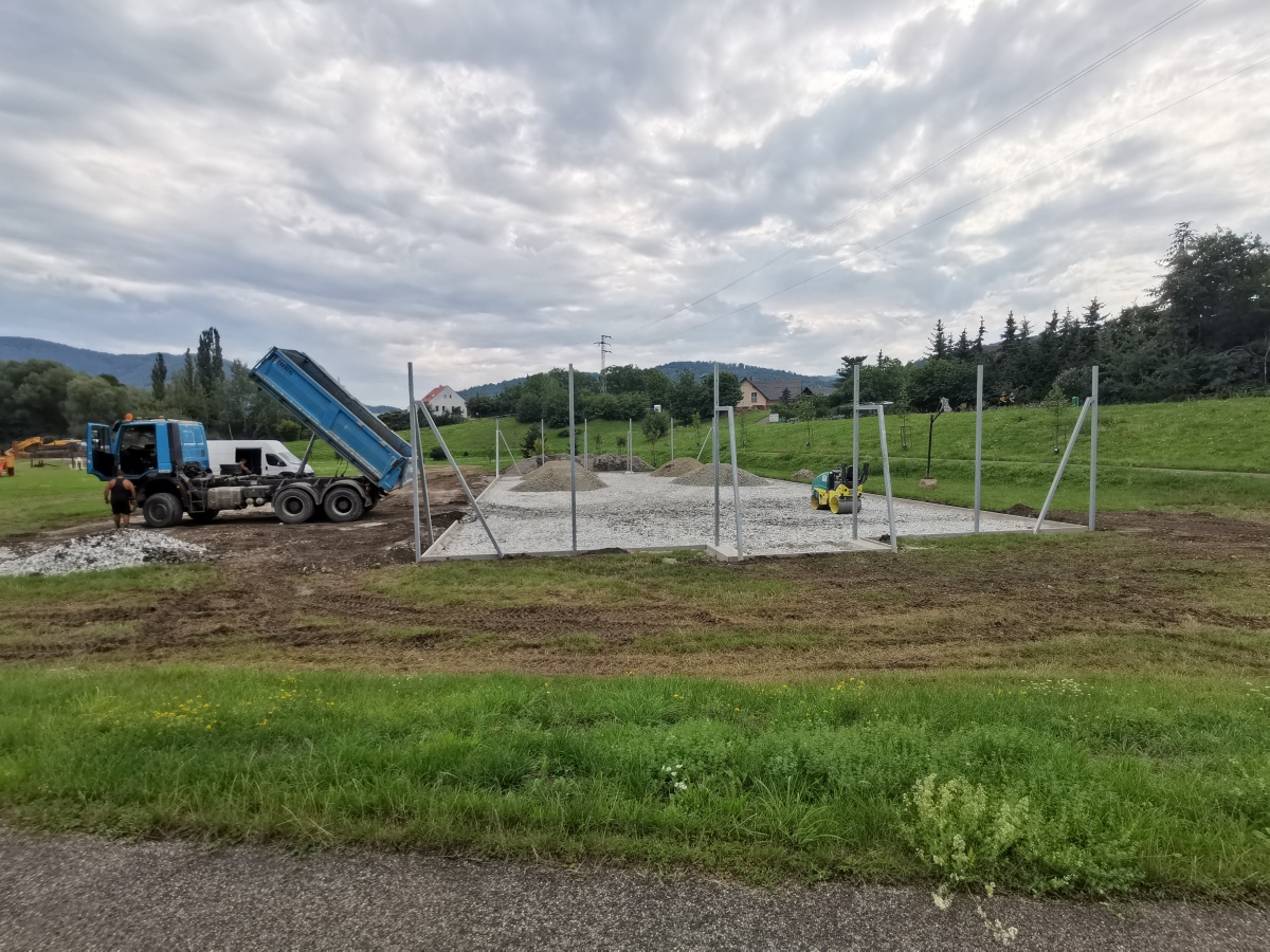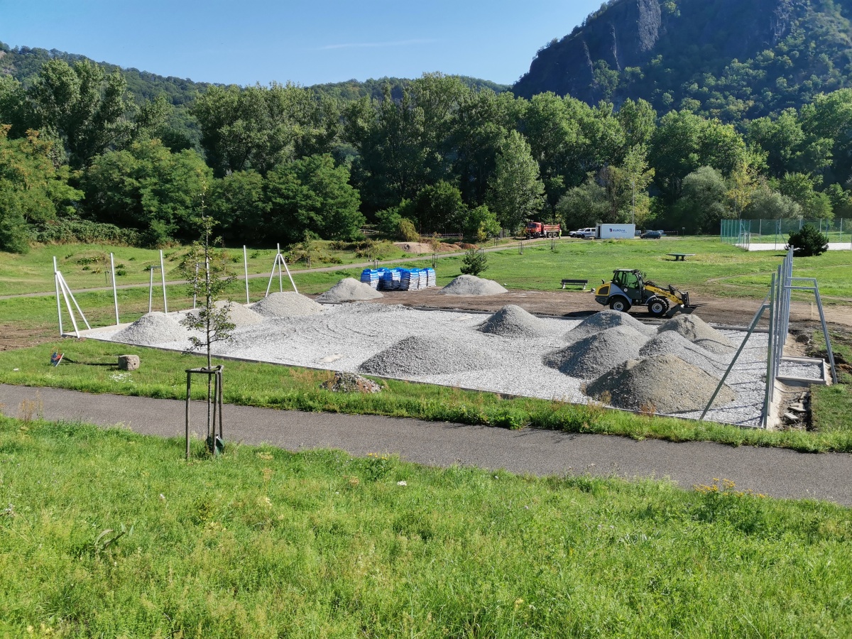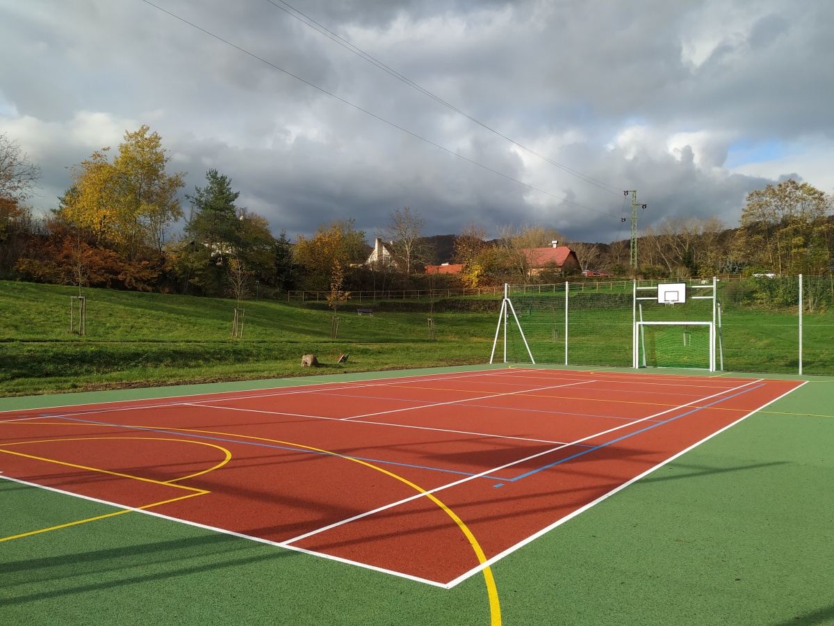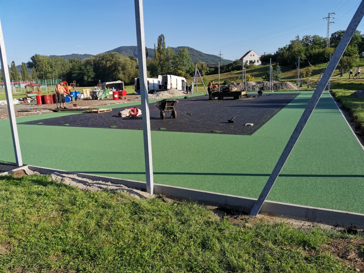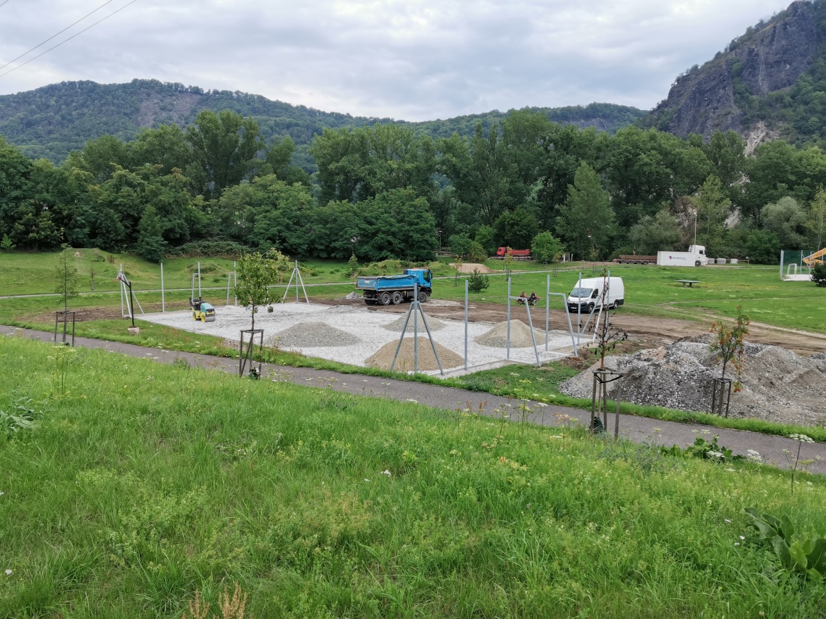 Rekonstrukce sportoviště ve valtířovské pískovně - 2023. Nové multifunkční hřiště s umělým povrchem nahrazuje původní hrubou asfaltovou plochu s rozbitým basketbalovým košem.