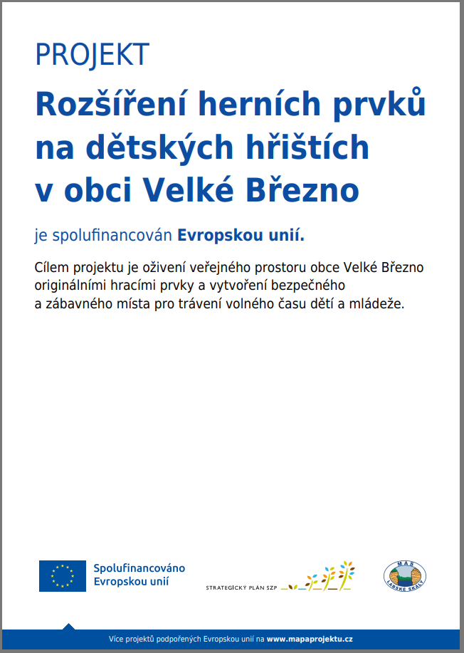 Výzvu v souladu s programovým rámcem Strategický plán Společná zemědělská politika (SP SZP) schváleným Ministerstvem zemědělství (ŘO SP SZP) vyhlásila MAS Labské skály, z. s. jako nositel "Strategie komunitně vedeného místního rozvoje MAS Labské skály na období 2021 - 2027“. Projekt „Rozšíření herních prvků na dětských hřištích v obci Velké Březno“ je spolufinancován Evropskou unií.