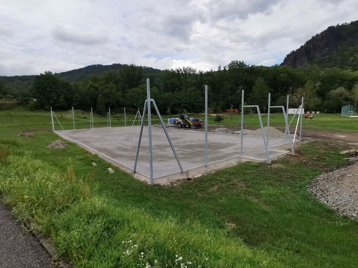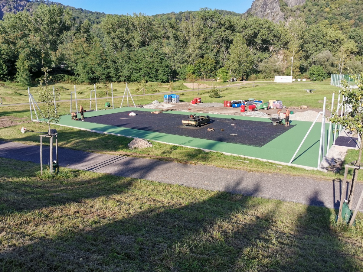 Rekonstrukce sportoviště ve valtířovské pískovně - 2023. Nové multifunkční hřiště s umělým povrchem nahrazuje původní hrubou asfaltovou plochu s rozbitým basketbalovým košem.