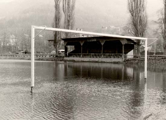 Povodeň na Labi a zaplavené hřiště v roce 1977.