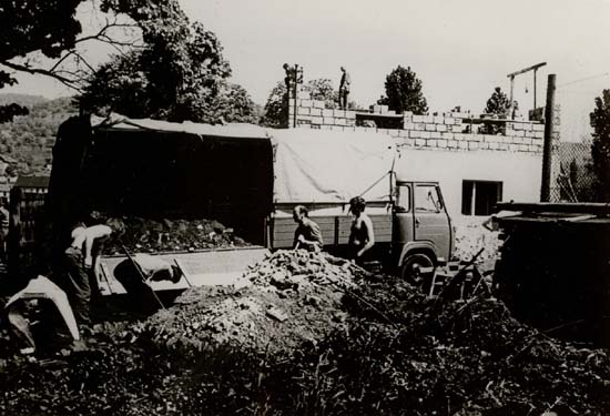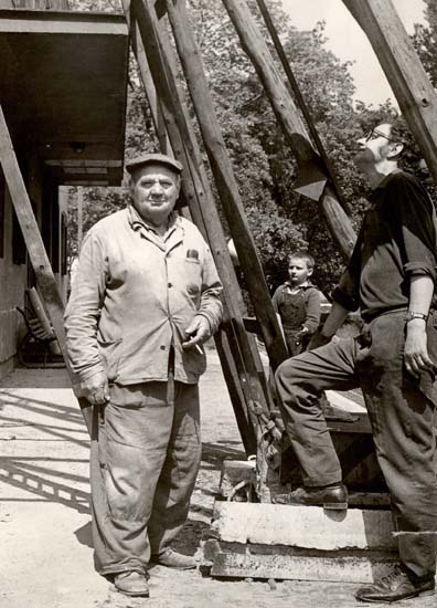 Přístavba ubytovny na zděných kabinách v r. 1973, zednický mistr p. Jaroslav Havlíček (vlevo) a p. Jaroslav Šafránek funkcionář.