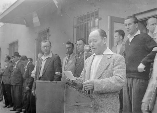 Projev při výročí založení Jiskry v 60. letech. Za řečnickým pultem je p. Jaroslav Šafránek, předs. TJ Jiskra, za ním stojí zprava: