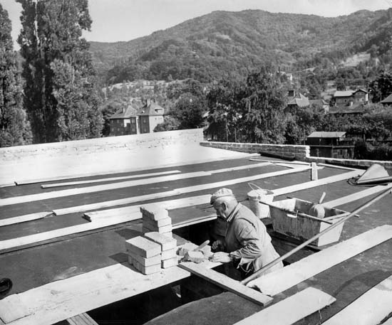 Rok 1974 - betonáž stropu a střechy ubytovny TJ, které dočišťuje mistr zednický p. Jaroslav Hlaváček.