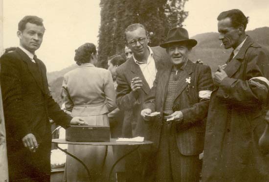 pokr. Václav Tichý, Vincenc Hajas, Václav Štrombach, Václav Horálek, Jiří Vichra, v pozadí Karel Schrödl (v klobouku a tmavých brýlích).