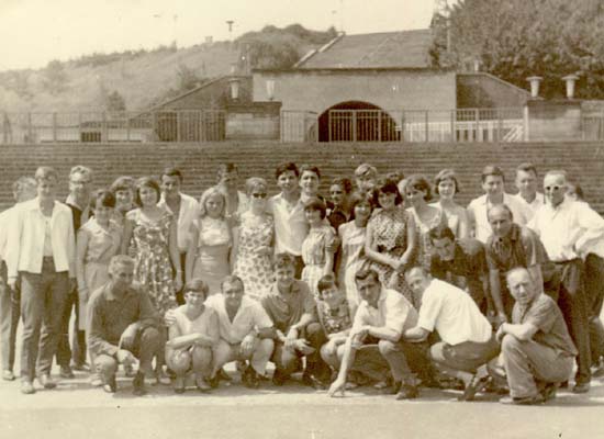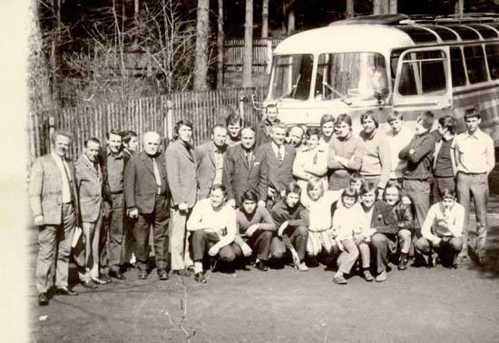 Brigádníci na nástavbě ubytovny v roce 1973. Zleva: Haspra, Josef Knotek, Jaroslav Pečiva, Václav Grus, pí. Táborská, Vondráček, Rudolf Slezák, Karol Darvaš, Josef Machač, Dan Smolař, Stanislav Mikeš,