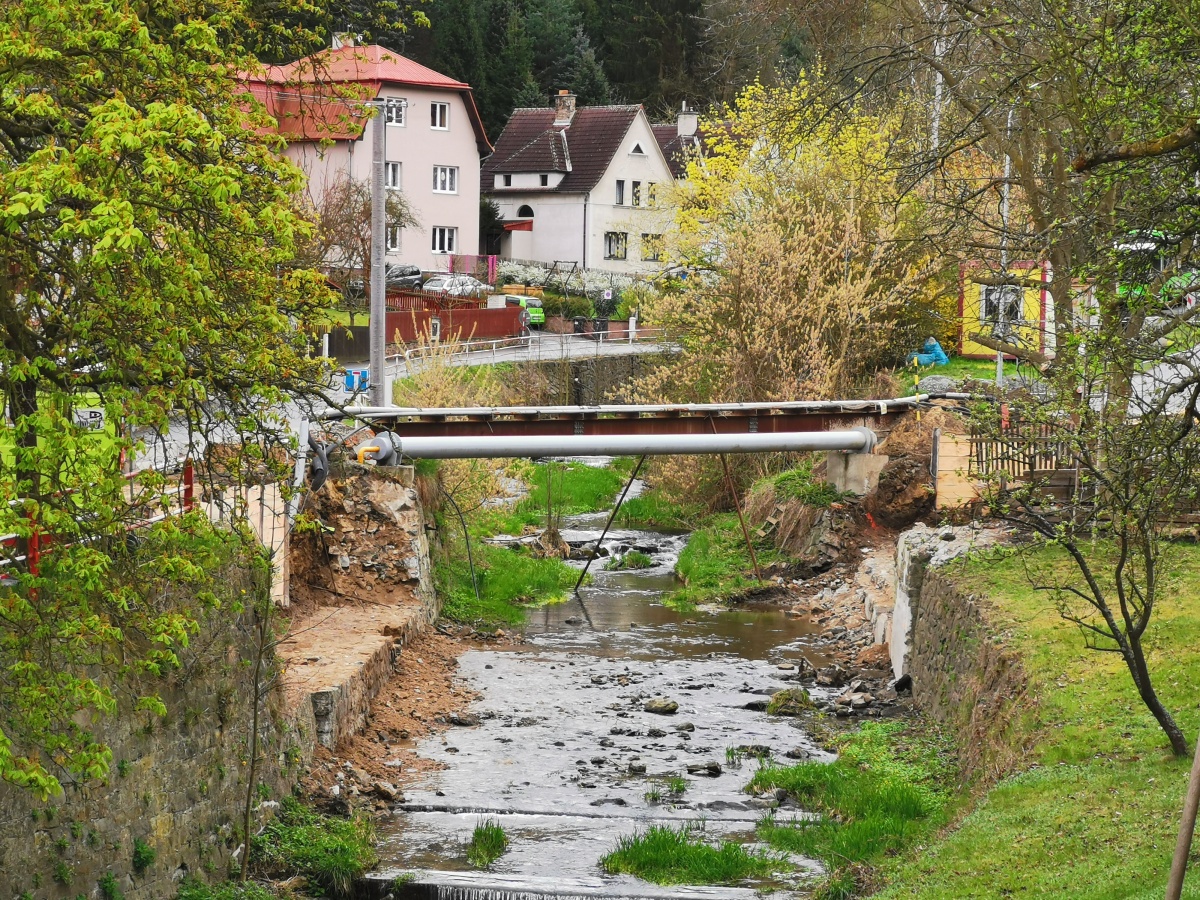 K řešení problému byl přizván projektant. Bylo nutno navrhnout takové řešení, aby na základě požadavku správce toku Lesů ČR nebyla v místě stavby zmenšena světlost stávajícího otvoru. Dále u pravobřežní strany jsou uloženy inženýrské sítě včetně plynovodu a je zde vedena místní komunikace. Pro zajištění stability komunikace a sítí (především plynovodu) byly navrženy mikropiloty s hlubinným založením. Tyto změny jsou zpracovávány projektantem a zároveň probíhá vyčíslení nákladů (VCP). Celková hodnota bohužel je okolo 30% z ceny podle SoD a naše organizace řeší způsob řádného profinancování.