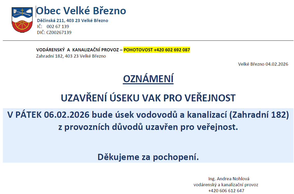 OZNÁMENÍ: UZAVŘENÍ ÚSEKU VAK V PÁTEK 6. 2. 2026