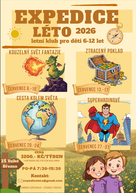 Zveme děti na Letní klub – příměstský tábor plný her, tvoření, pohybu a letní zábavy, který se uskuteční v prostorách Základní školy Velké Březno. Připravujeme pestrý program, kde si děti užijí léto s kamarády v bezpečném a podporujícím prostředí.