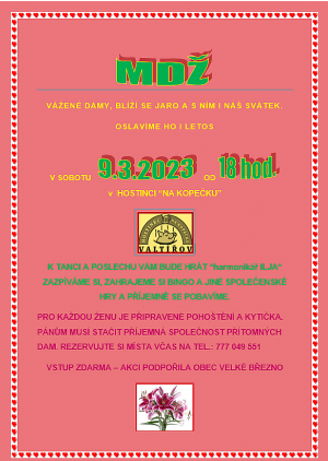Všem ženám přeji krásný Mezinárodní den žen třeba s oslavou v Hostinci Na Kopečku (viz pozvánka na MDŽ) a všem ostatním klidný víkend.